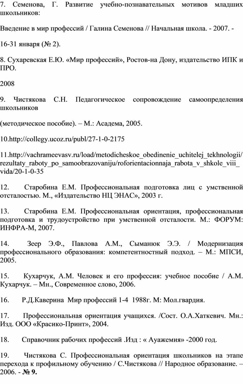 13. Старобина Е.М. Профессиональная ориентация, профессиональная подготовка и трудоустройство при умственной отсталости. М.: ФОРУМ: ИНФРА-М, 2007.