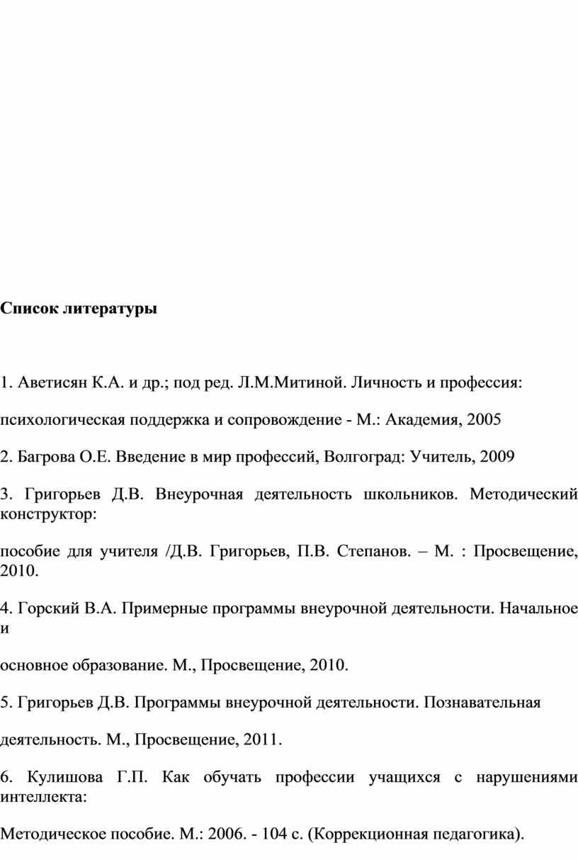 2. Багрова О.Е. Введение в мир профессий, Волгоград: Учитель, 2009