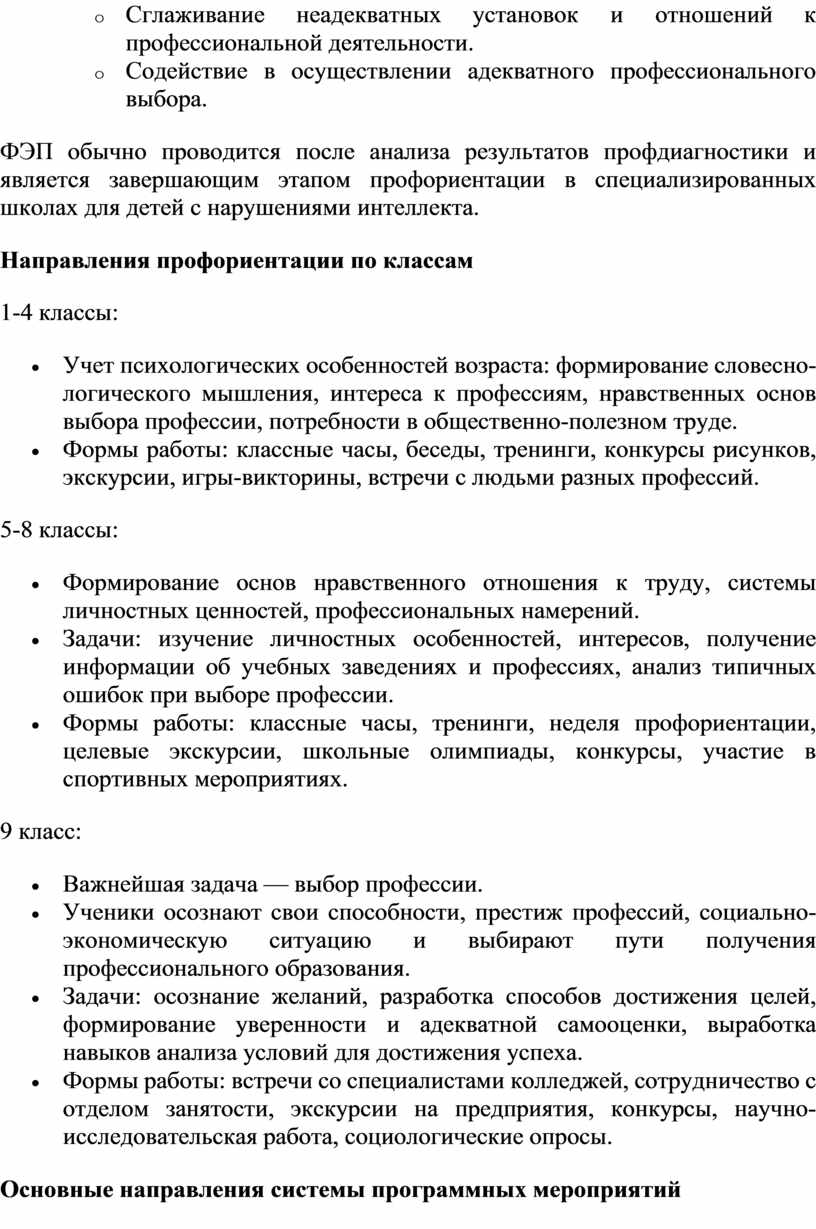 Таким образом, существует ряд серьёзных проблем, которые препятствуют профессиональной интеграции в общество людей с интеллектуальным недоразвитием. Для решения этой проблемы была разработана программа, включающая систему организационно-методических и практических мероприятий по профориентации и самоопределению учащихся коррекционной школы. Цель программы — не только предоставить информацию о мире профессий, но и способствовать личностному развитию выпускников, формированию у них способности оценивать свои возможности в соответствии с требованиями профессии, что необходимо для успешной социальной и профессиональной адаптации.