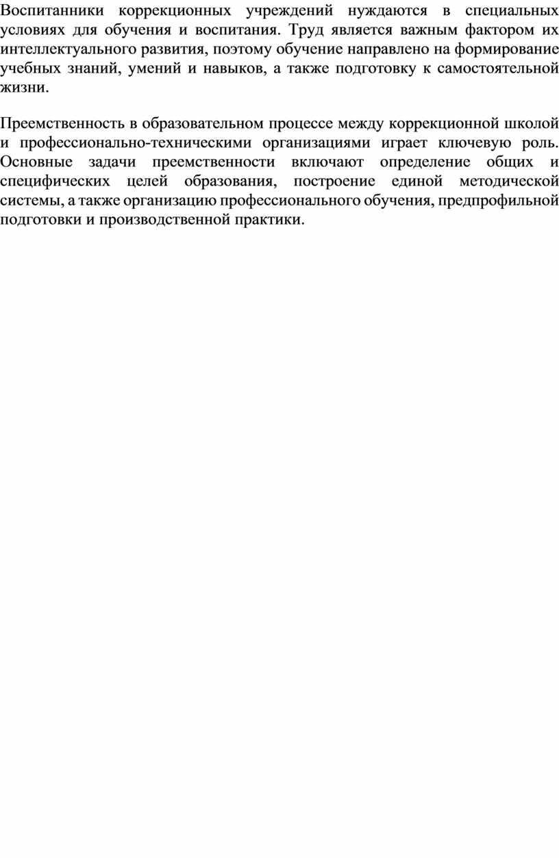 Преемственность в образовательном процессе между коррекционной школой и профессионально-техническими организациями играет ключевую роль. Основные задачи преемственности включают определение общих и специфических целей образования, построение единой методической системы, а также организацию профессионального обучения, предпрофильной подготовки и производственной практики.