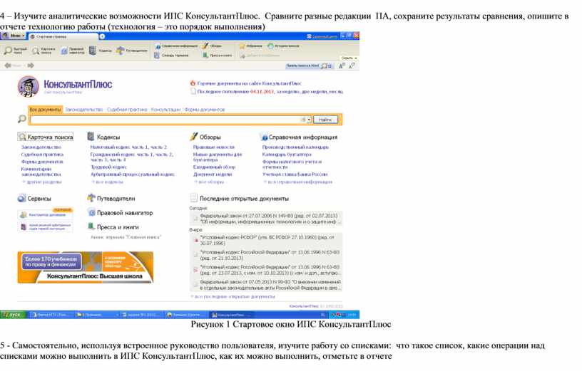 4 – Изучите аналитические возможности ИПС КонсультантПлюс. Сравните разные редакции ПА, сохраните результаты сравнения, опишите в отчете технологию работы (технология – это порядок выполнения)