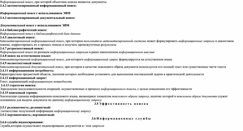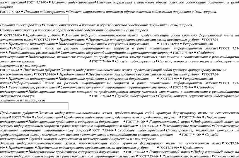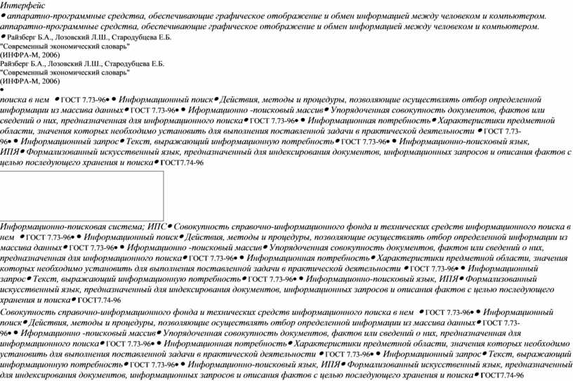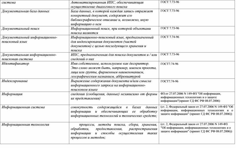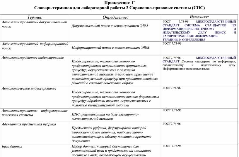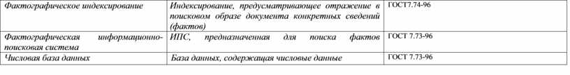 6 – Познакомьтесь с существующей официальной терминологией в области ИПС (ГОСТ 7.73 — 96. Система стандартов по информации, библиотечному и издательскому делу. ПОИСК И РАСПРОСТРАНЕНИЕ ИНФОРМАЦИИ. Термины и определения. Фрагмент ГОСТ 7.73-96 в Приложении А). Изучите основные термины, их перечень представьте в отчете. В Приложении Г приведены термины, полезные для выполнения работы.