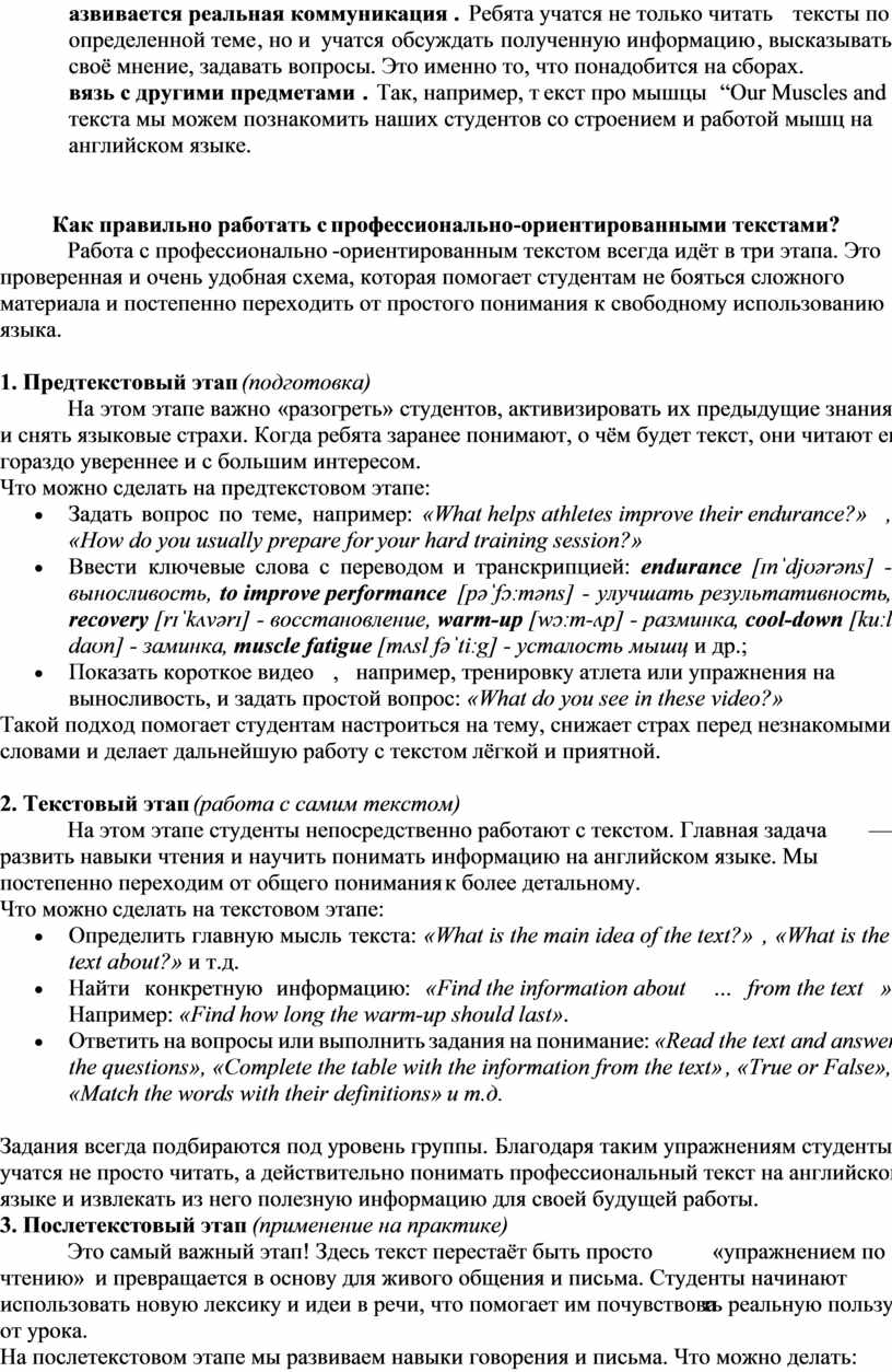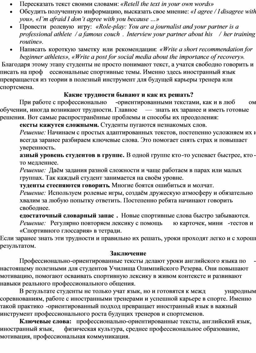 Профессионально-ориентированные тексты делают уроки английского языка по-настоящему полезными для студентов Училища Олимпийского Резерва. Они повышают мотивацию, помогают осваивать спортивную лексику в живом контексте и развивают навыки реального профессионального общения.