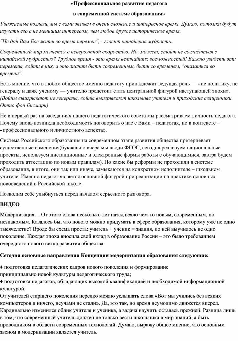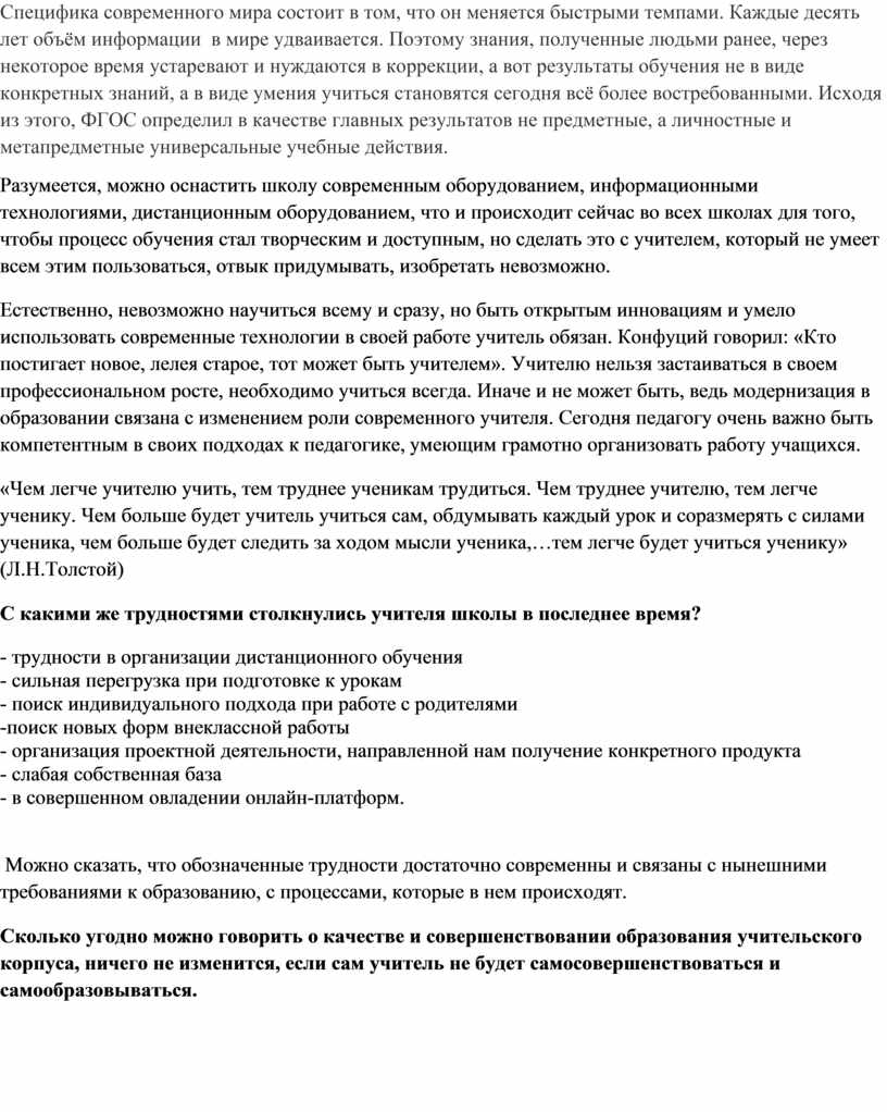 Система Российского образования на современном этапе развития общества претерпевает существенные изменения(буквально вчера мы вводи ФГОС, сегодня реализуем национальные проекты, используем дистанционные и электронные формы работы с обучающимися, завтра будем проходить аттестацию по новым правилам). Но какие бы реформы не проходили в системе образования, в итоге, они так или иначе, замыкаются на конкретном исполнителе – школьном учителе. Именно педагог является основной фигурой при реализации на практике основных нововведений в Российской школе.