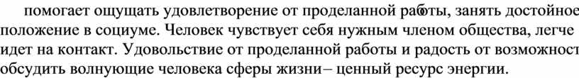 Осознанное профессиональное самоопределение развивает сильные стороны, помогает ощущать удовлетворение от проделанной работы, занять достойное положение в социуме. Человек чувствует себя нужным членом общества, легче идет на контакт. Удовольствие от проделанной работы и радость от возможности обсудить волнующие человека сферы жизни – ценный ресурс энергии.