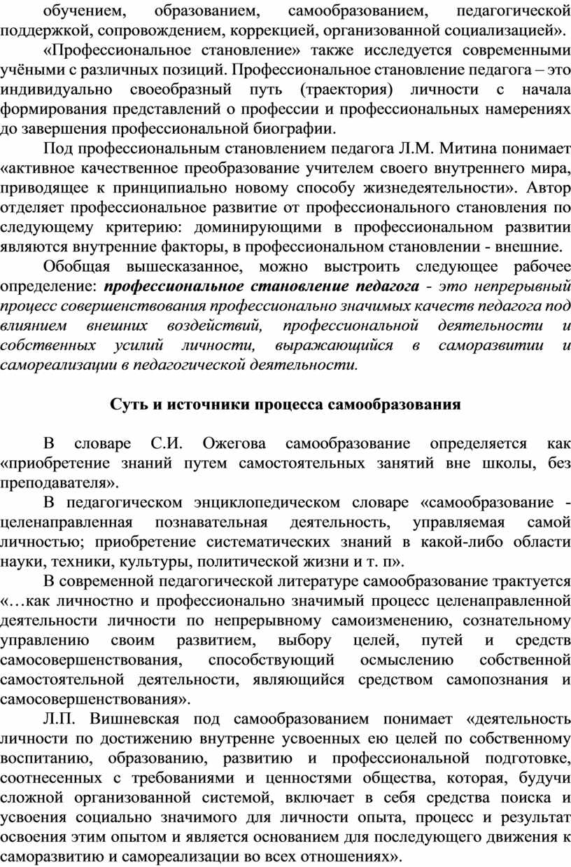В современной педагогической литературе самообразование трактуется «…как личностно и профессионально значимый процесс целенаправленной деятельности личности по непрерывному самоизменению, сознательному управлению своим развитием, выбору целей, путей и средств самосовершенствования, способствующий осмыслению собственной самостоятельной деятельности, являющийся средством самопознания и самосовершенствования».