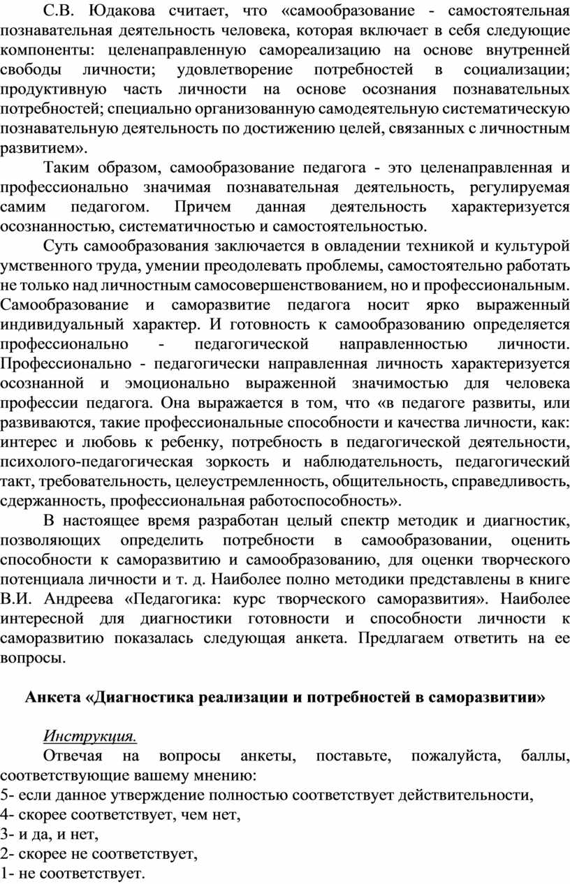 В настоящее время разработан целый спектр методик и диагностик, позволяющих определить потребности в самообразовании, оценить способности к саморазвитию и самообразованию, для оценки творческого потенциала личности и т. д. Наиболее полно методики представлены в книге В.И. Андреева «Педагогика: курс творческого саморазвития». Наиболее интересной для диагностики готовности и способности личности к саморазвитию показалась следующая анкета. Предлагаем ответить на ее вопросы.