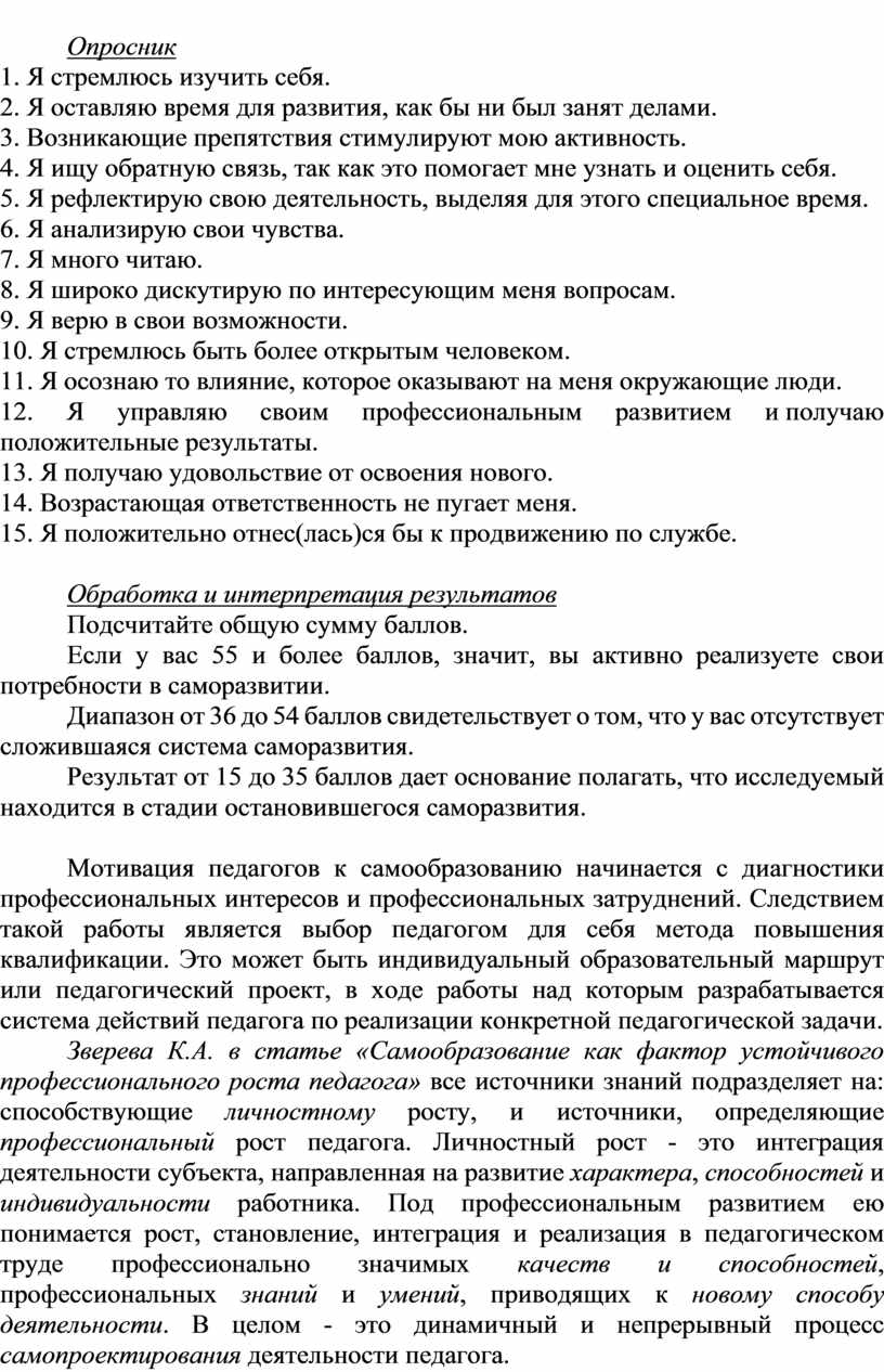 Зверева К.А. в статье «Самообразование как фактор устойчивого профессионального роста педагога» все источники знаний подразделяет на: способствующие личностному росту, и источники, определяющие профессиональный рост педагога. Личностный рост - это интеграция деятельности субъекта, направленная на развитие характера, способностей и индивидуальности работника. Под профессиональным развитием ею понимается рост, становление, интеграция и реализация в педагогическом труде профессионально значимых качеств и способностей, профессиональных знаний и умений, приводящих к новому способу деятельности. В целом - это динамичный и непрерывный процесс самопроектирования деятельности педагога.