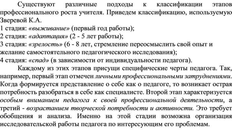 Существуют различные подходы к классификации этапов профессионального роста учителя. Приведем классификацию, используемую Зверевой К.А.
