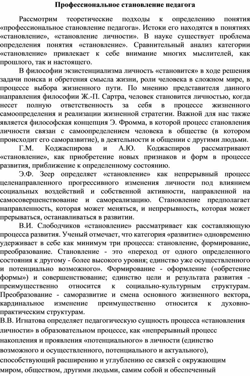 «Профессиональное становление» также исследуется современными учёными с различных позиций. Профессиональное становление педагога – это индивидуально своеобразный путь (траектория) личности с начала формирования представлений о профессии и профессиональных намерениях до завершения профессиональной биографии.