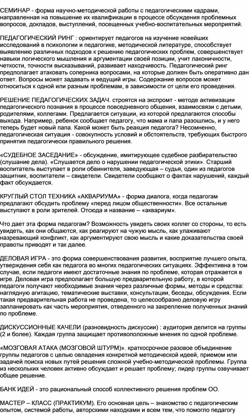 СЕМИНАР - форма научно-методической работы с педагогическими кадрами, направленная на повышение их квалификации в процессе обсуждения проблемных вопросов, докладов, выступлений, посещенных учебно-воспитательных мероприятий.
