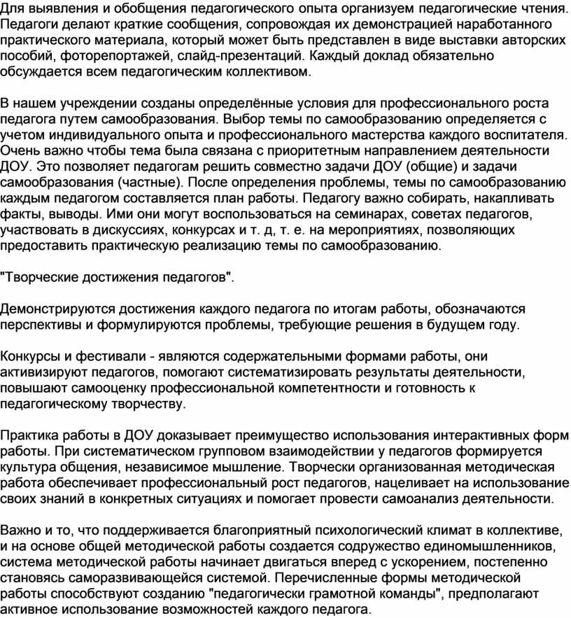 Для выявления и обобщения педагогического опыта организуем педагогические чтения. Педагоги делают краткие сообщения, сопровождая их демонстрацией наработанного практического материала, который может быть представлен в виде выставки авторских пособий, фоторепортажей, слайд-презентаций. Каждый доклад обязательно обсуждается всем педагогическим коллективом.