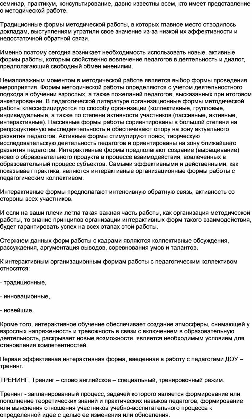 Традиционные организационные формы такой работы, такие, как педагогический совет, семинар, практикум, консультирование, давно известны всем, кто имеет представление о методической работе.