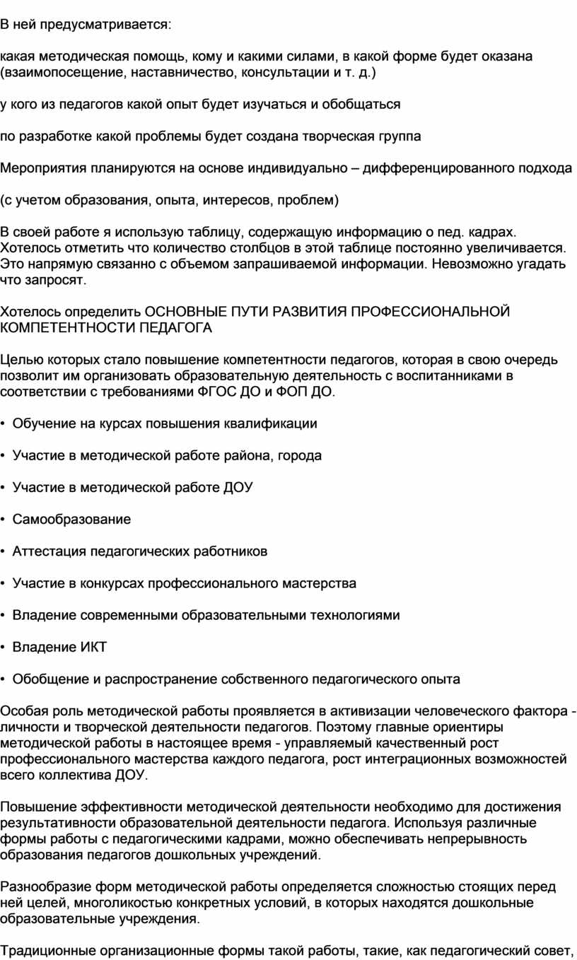 Повышение эффективности методической деятельности необходимо для достижения результативности образовательной деятельности педагога. Используя различные формы работы с педагогическими кадрами, можно обеспечивать непрерывность образования педагогов дошкольных учреждений.