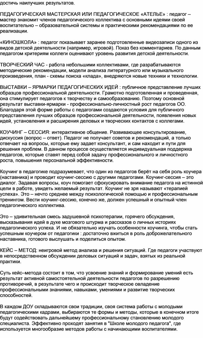 В каждом ДОУ складываются свои традиции, своя система работы с молодыми педагогическими кадрами, выбираются те формы и методы, которые в конечном итоге будут содействовать дальнейшему профессиональному становлению молодого специалиста. Эффективно проходят занятия в "Школе молодого педагога", где используется многообразие методов работы с начинающими воспитателями.