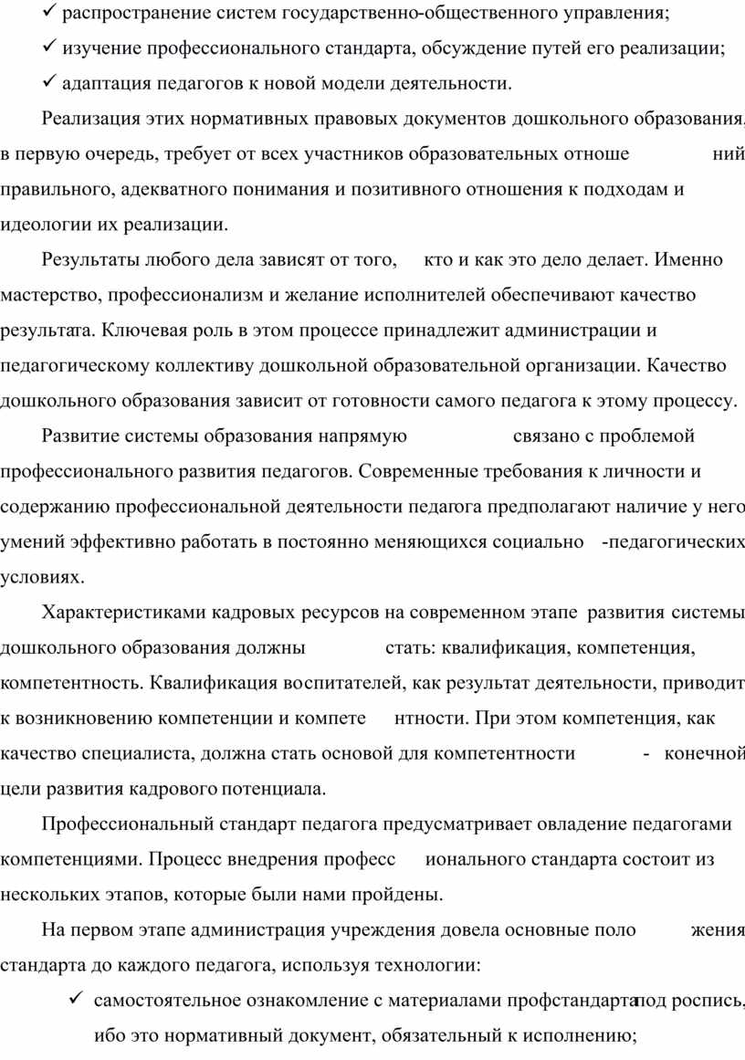 Характеристиками кадровых ресурсов на современном этапе развития системы дошкольного образования должны стать: квалификация, компетенция, компетентность. Квалификация воспитателей, как результат деятельности, приводит к возникновению компетенции и компетентности. При этом компетенция, как качество специалиста, должна стать основой для компетентности - конечной цели развития кадрового потенциала.