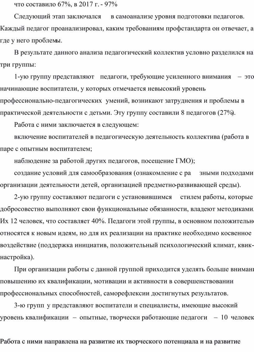 При организации работы с данной группой приходится уделять больше внимания повышению их квалификации, мотивации и активности в совершенствовании профессиональных способностей, саморефлексии достигнутых результатов.
