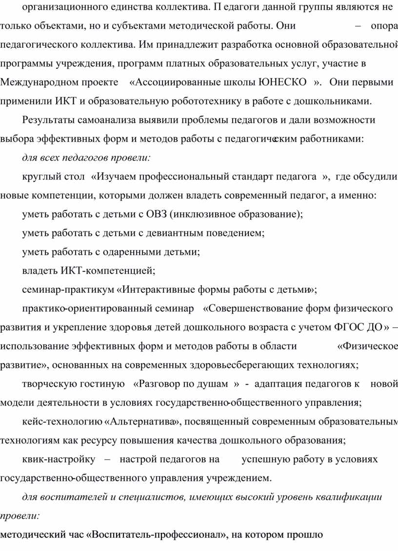 Работа с ними направлена на развитие их творческого потенциала и на развитие организационного единства коллектива. Педагоги данной группы являются не только объектами, но и субъектами методической работы. Они – опора педагогического коллектива. Им принадлежит разработка основной образовательной программы учреждения, программ платных образовательных услуг, участие в Международном проекте «Ассоциированные школы ЮНЕСКО». Они первыми применили ИКТ и образовательную робототехнику в работе с дошкольниками.