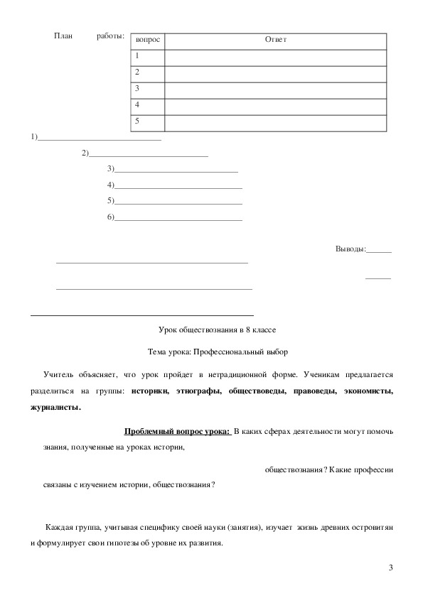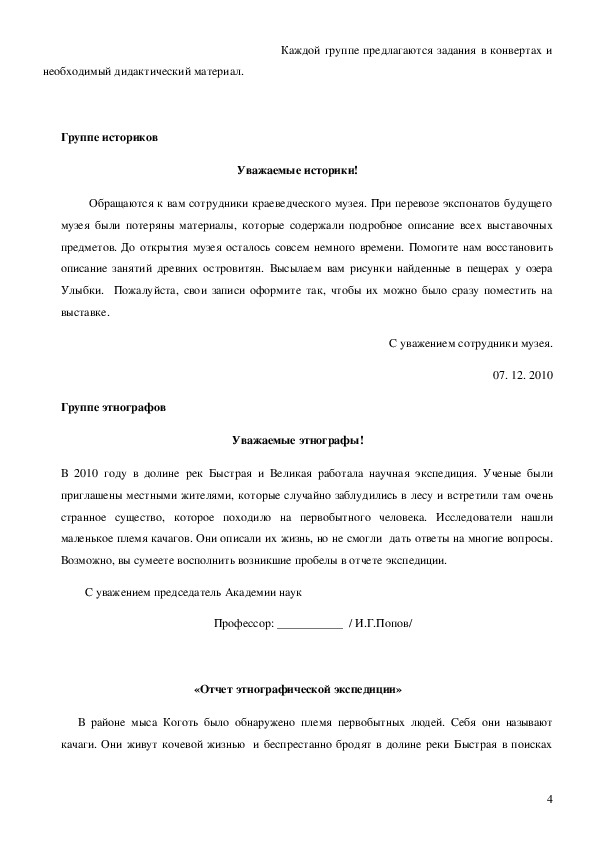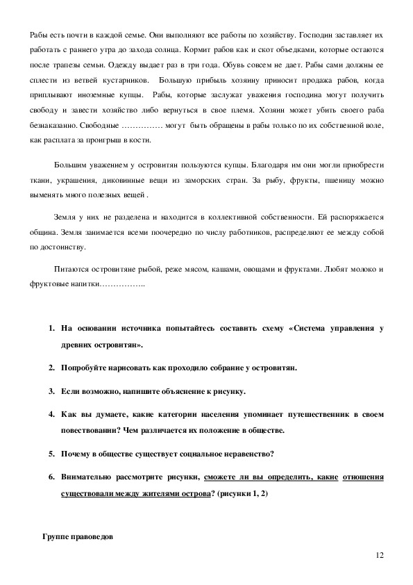 Каждая группа, учитывая специфику своей науки (занятия), изучает жизнь древних островитян и формулирует свои гипотезы об уровне их развития.