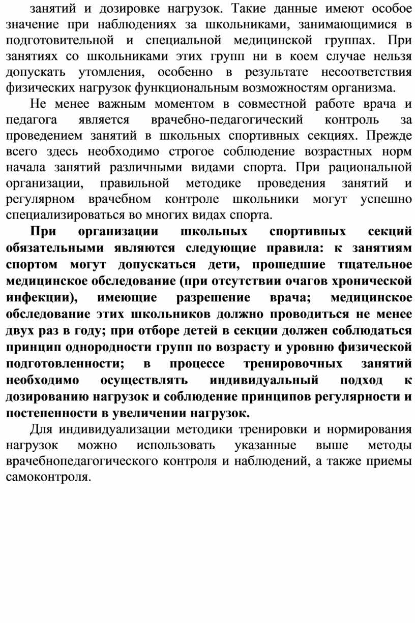 Не менее важным моментом в совместной работе врача и педагога является врачебно-педагогический контроль за проведением занятий в школьных спортивных секциях. Прежде всего здесь необходимо строгое соблюдение возрастных норм начала занятий различными видами спорта. При рациональной организации, правильной методике проведения занятий и регулярном врачебном контроле школьники могут успешно специализироваться во многих видах спорта.