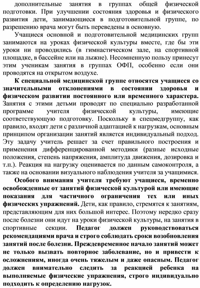Особого внимания учителя требуют учащиеся, временно освобожденные от занятий физической культурой или имеющие показания для частичного ограничения тех или иных физических упражнений. Дети, как правило, стремятся к занятиям, представляющим для них большой интерес. Поэтому нередко сразу после болезни они идут на уроки физической культуры, на занятия в спортивные секции. Педагог должен руководствоваться рекомендациями врача и строго соблюдать сроки возобновления занятий после болезни. Преждевременное начало занятий может не только вызвать повторное заболевание, но и привести к осложнениям, иногда очень тяжелым и даже опасным. Педагог должен внимательно следить за реакцией ребенка на выполняемые физические упражнения, строго индивидуально подходить к определению нагрузок.