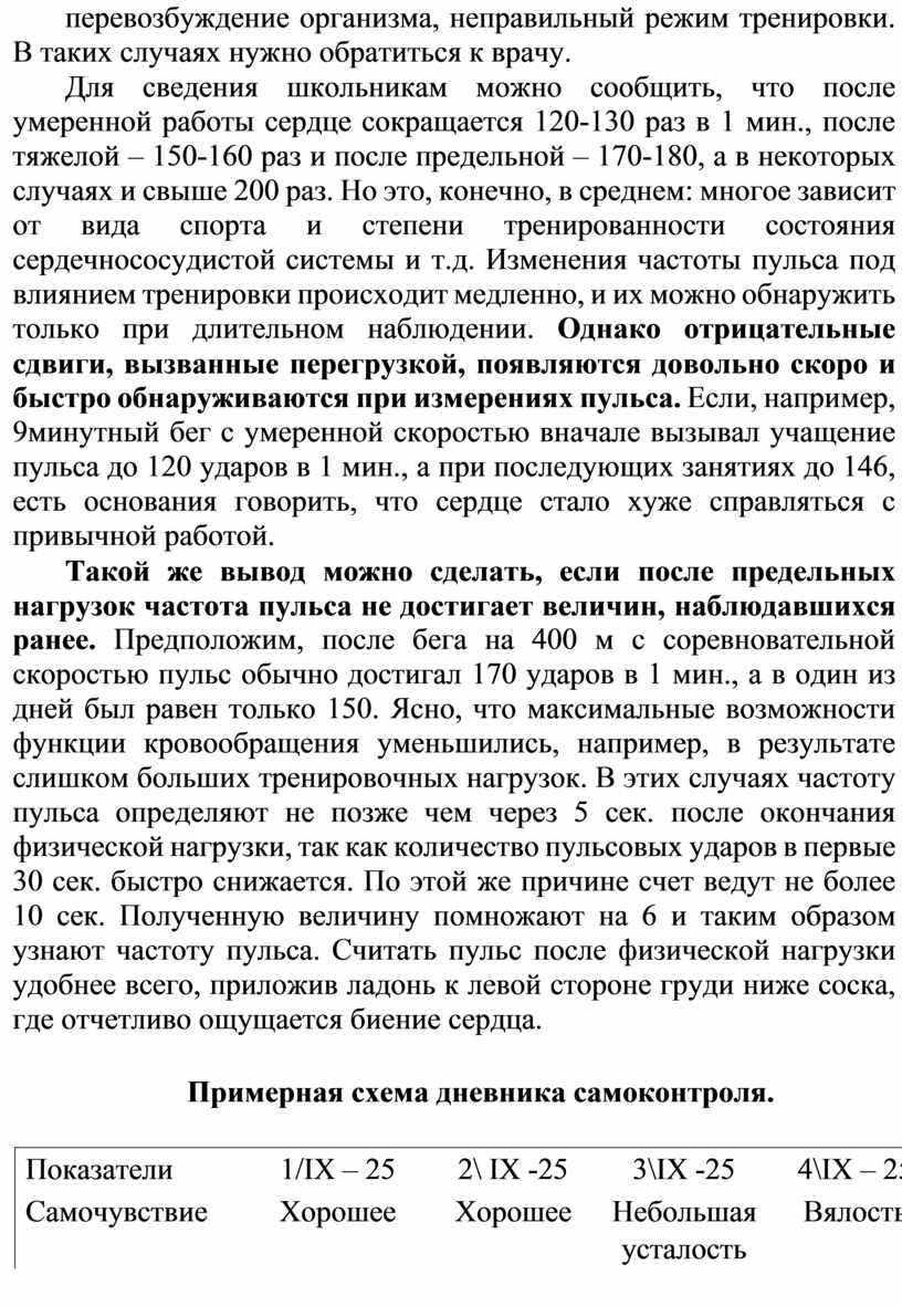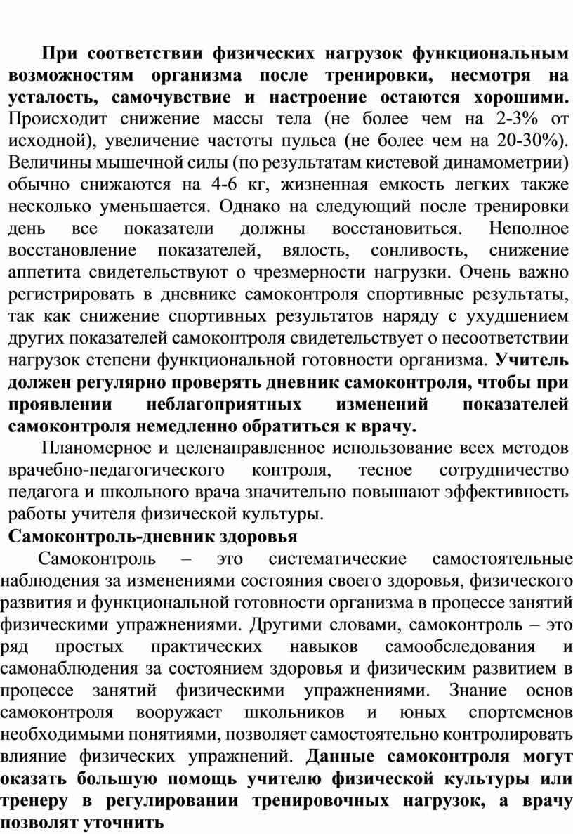 При соответствии физических нагрузок функциональным возможностям организма после тренировки, несмотря на усталость, самочувствие и настроение остаются хорошими. Происходит снижение массы тела (не более чем на 2-3% от исходной), увеличение частоты пульса (не более чем на 20-30%). Величины мышечной силы (по результатам кистевой динамометрии) обычно снижаются на 4-6 кг, жизненная емкость легких также несколько уменьшается. Однако на следующий после тренировки день все показатели должны восстановиться. Неполное восстановление показателей, вялость, сонливость, снижение аппетита свидетельствуют о чрезмерности нагрузки. Очень важно регистрировать в дневнике самоконтроля спортивные результаты, так как снижение спортивных результатов наряду с ухудшением других показателей самоконтроля свидетельствует о несоответствии нагрузок степени функциональной готовности организма. Учитель должен регулярно проверять дневник самоконтроля, чтобы при проявлении неблагоприятных изменений показателей самоконтроля немедленно обратиться к врачу.