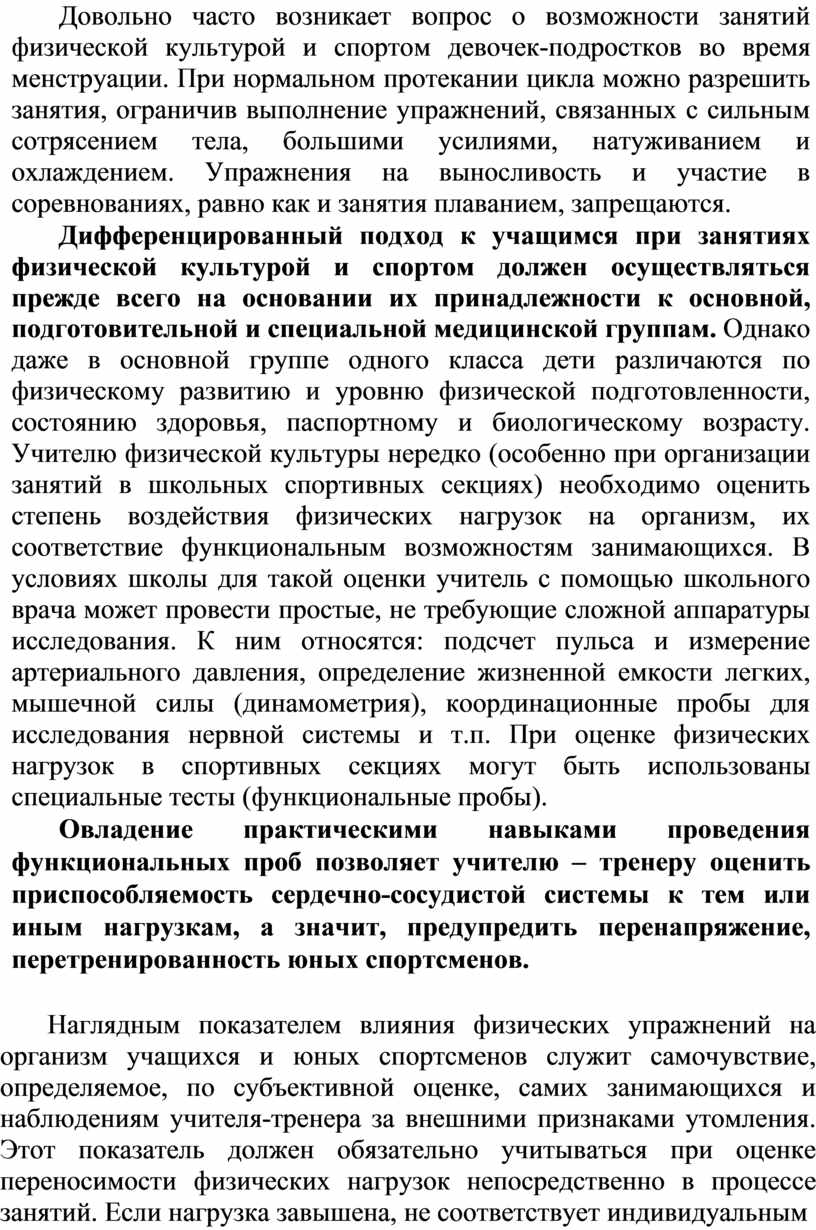 Довольно часто возникает вопрос о возможности занятий физической культурой и спортом девочек-подростков во время менструации. При нормальном протекании цикла можно разрешить занятия, ограничив выполнение упражнений, связанных с сильным сотрясением тела, большими усилиями, натуживанием и охлаждением. Упражнения на выносливость и участие в соревнованиях, равно как и занятия плаванием, запрещаются.