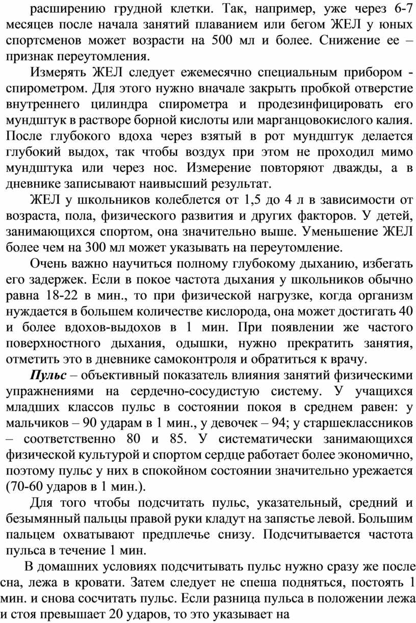 Жизненная емкость легких (ЖЕЛ) тоже изменяется под влиянием систематических занятий физическими упражнениями, которые способствуют развитию дыхательной мускулатуры и расширению грудной клетки. Так, например, уже через 6-7 месяцев после начала занятий плаванием или бегом ЖЕЛ у юных спортсменов может возрасти на 500 мл и более. Снижение ее – признак переутомления.