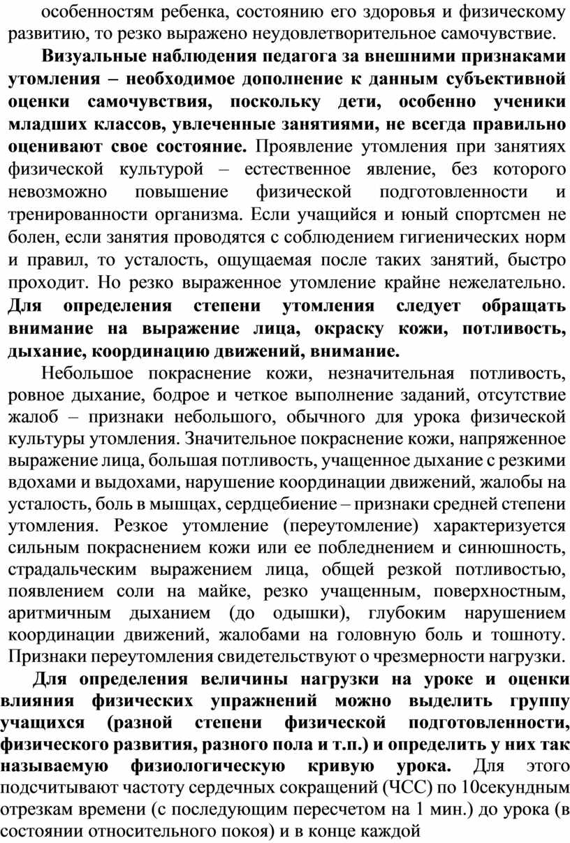 Небольшое покраснение кожи, незначительная потливость, ровное дыхание, бодрое и четкое выполнение заданий, отсутствие жалоб – признаки небольшого, обычного для урока физической культуры утомления. Значительное покраснение кожи, напряженное выражение лица, большая потливость, учащенное дыхание с резкими вдохами и выдохами, нарушение координации движений, жалобы на усталость, боль в мышцах, сердцебиение – признаки средней степени утомления. Резкое утомление (переутомление) характеризуется сильным покраснением кожи или ее побледнением и синюшность, страдальческим выражением лица, общей резкой потливостью, появлением соли на майке, резко учащенным, поверхностным, аритмичным дыханием (до одышки), глубоким нарушением координации движений, жалобами на головную боль и тошноту. Признаки переутомления свидетельствуют о чрезмерности нагрузки.