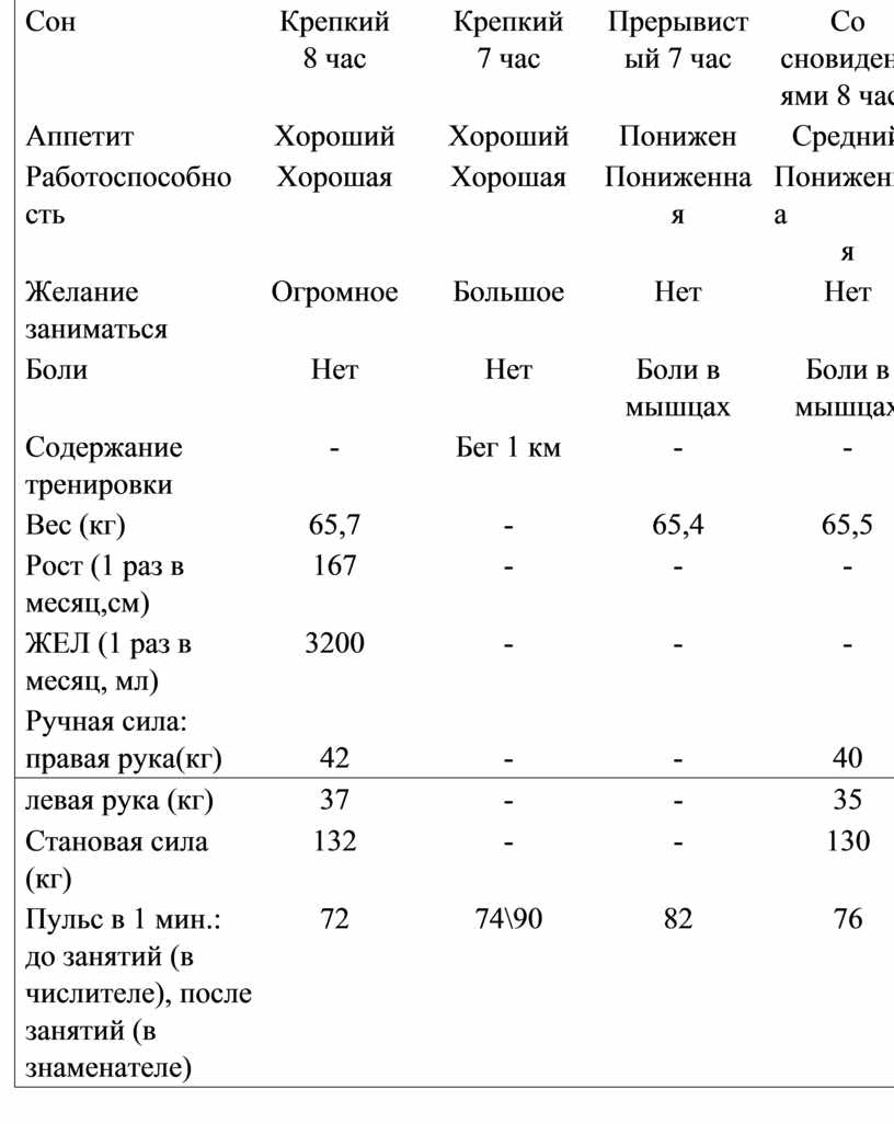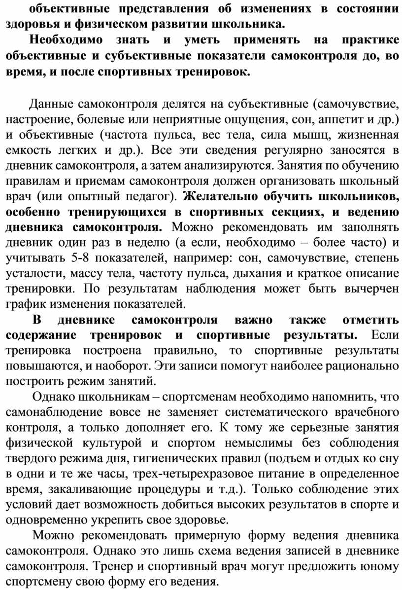 Данные самоконтроля делятся на субъективные (самочувствие, настроение, болевые или неприятные ощущения, сон, аппетит и др.) и объективные (частота пульса, вес тела, сила мышц, жизненная емкость легких и др.). Все эти сведения регулярно заносятся в дневник самоконтроля, а затем анализируются. Занятия по обучению правилам и приемам самоконтроля должен организовать школьный врач (или опытный педагог). Желательно обучить школьников, особенно тренирующихся в спортивных секциях, и ведению дневника самоконтроля. Можно рекомендовать им заполнять дневник один раз в неделю (а если, необходимо – более часто) и учитывать 5-8 показателей, например: сон, самочувствие, степень усталости, массу тела, частоту пульса, дыхания и краткое описание тренировки. По результатам наблюдения может быть вычерчен график изменения показателей.