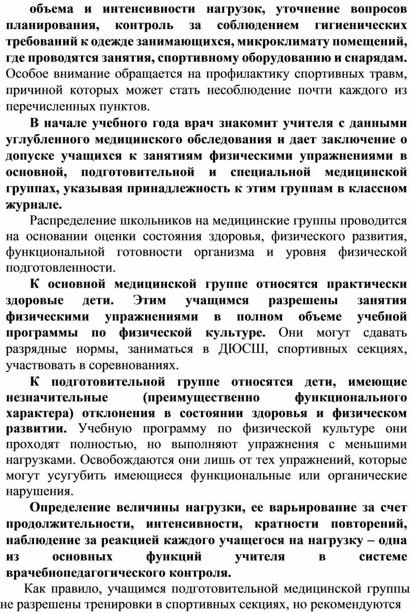 Определение величины нагрузки, ее варьирование за счет продолжительности, интенсивности, кратности повторений, наблюдение за реакцией каждого учащегося на нагрузку – одна из основных функций учителя в системе врачебнопедагогического контроля.