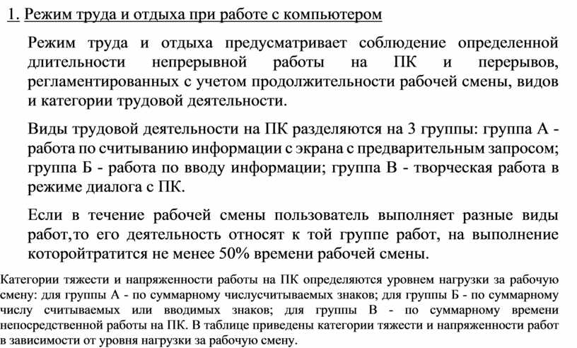 Режим труда и отдыха предусматривает соблюдение определенной длительности непрерывной работы на ПК и перерывов, регламентированных с учетом продолжительности рабочей смены, видов и категории трудовой деятельности.