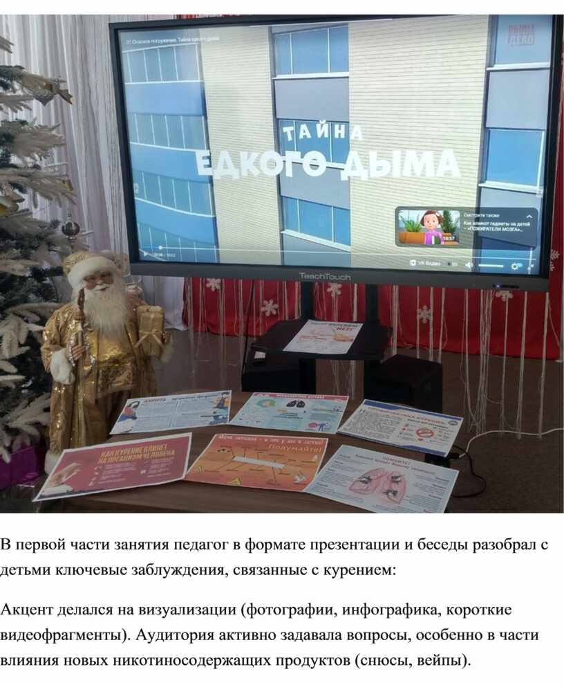 В первой части занятия педагог в формате презентации и беседы разобрал с детьми ключевые заблуждения, связанные с курением:
