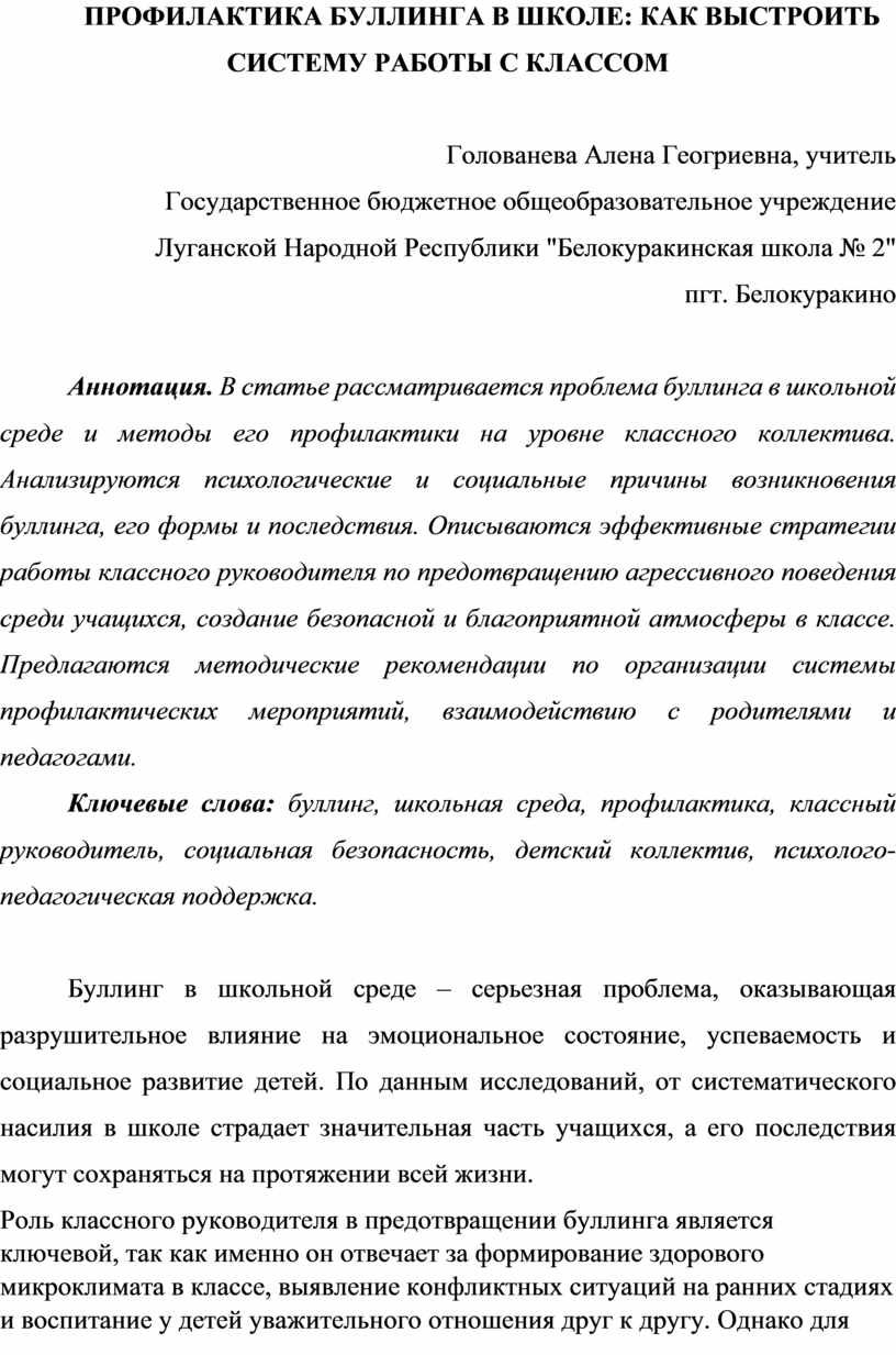 Аннотация. В статье рассматривается проблема буллинга в школьной среде и методы его профилактики на уровне классного коллектива. Анализируются психологические и социальные причины возникновения буллинга, его формы и последствия. Описываются эффективные стратегии работы классного руководителя по предотвращению агрессивного поведения среди учащихся, создание безопасной и благоприятной атмосферы в классе. Предлагаются методические рекомендации по организации системы профилактических мероприятий, взаимодействию с родителями и педагогами.