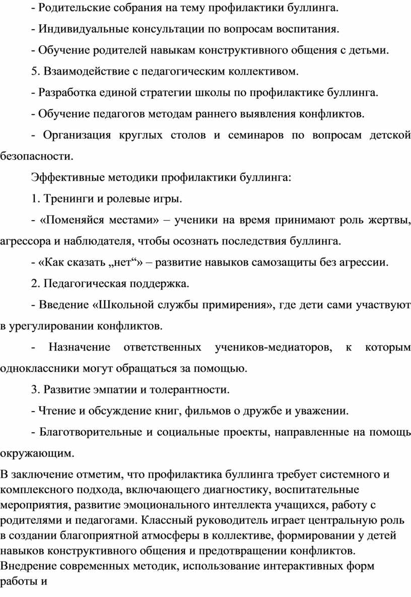 В заключение отметим, что профилактика буллинга требует системного и комплексного подхода, включающего диагностику, воспитательные мероприятия, развитие эмоционального интеллекта учащихся, работу с родителями и педагогами. Классный руководитель играет центральную роль в создании благоприятной атмосферы в коллективе, формировании у детей навыков конструктивного общения и предотвращении конфликтов. Внедрение современных методик, использование интерактивных форм работы и междисциплинарное взаимодействие помогут значительно снизить уровень насилия в школе и создать безопасную образовательную среду.