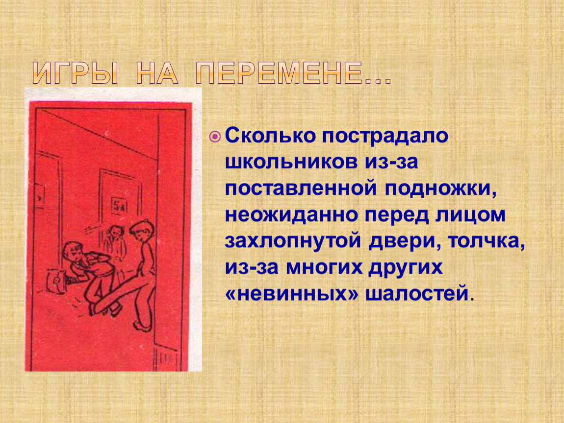 Сколько пострадало школьников из-за поставленной подножки, неожиданно перед лицом захлопнутой двери, толчка, из-за многих других «невинных» шалостей.