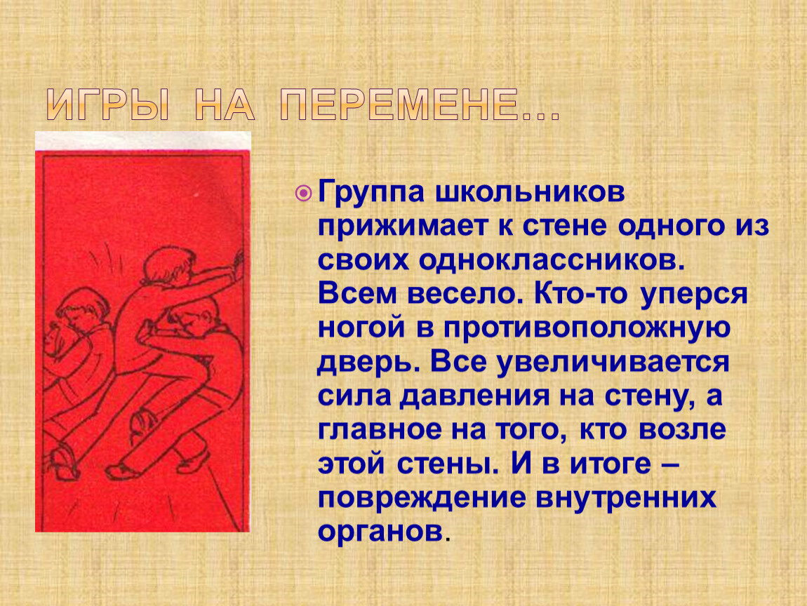 Группа школьников прижимает к стене одного из своих одноклассников. Всем весело. Кто-то уперся ногой в противоположную дверь. Все увеличивается сила давления на стену, а главное на того, кто возле этой стены. И в итоге – повреждение внутренних органов.