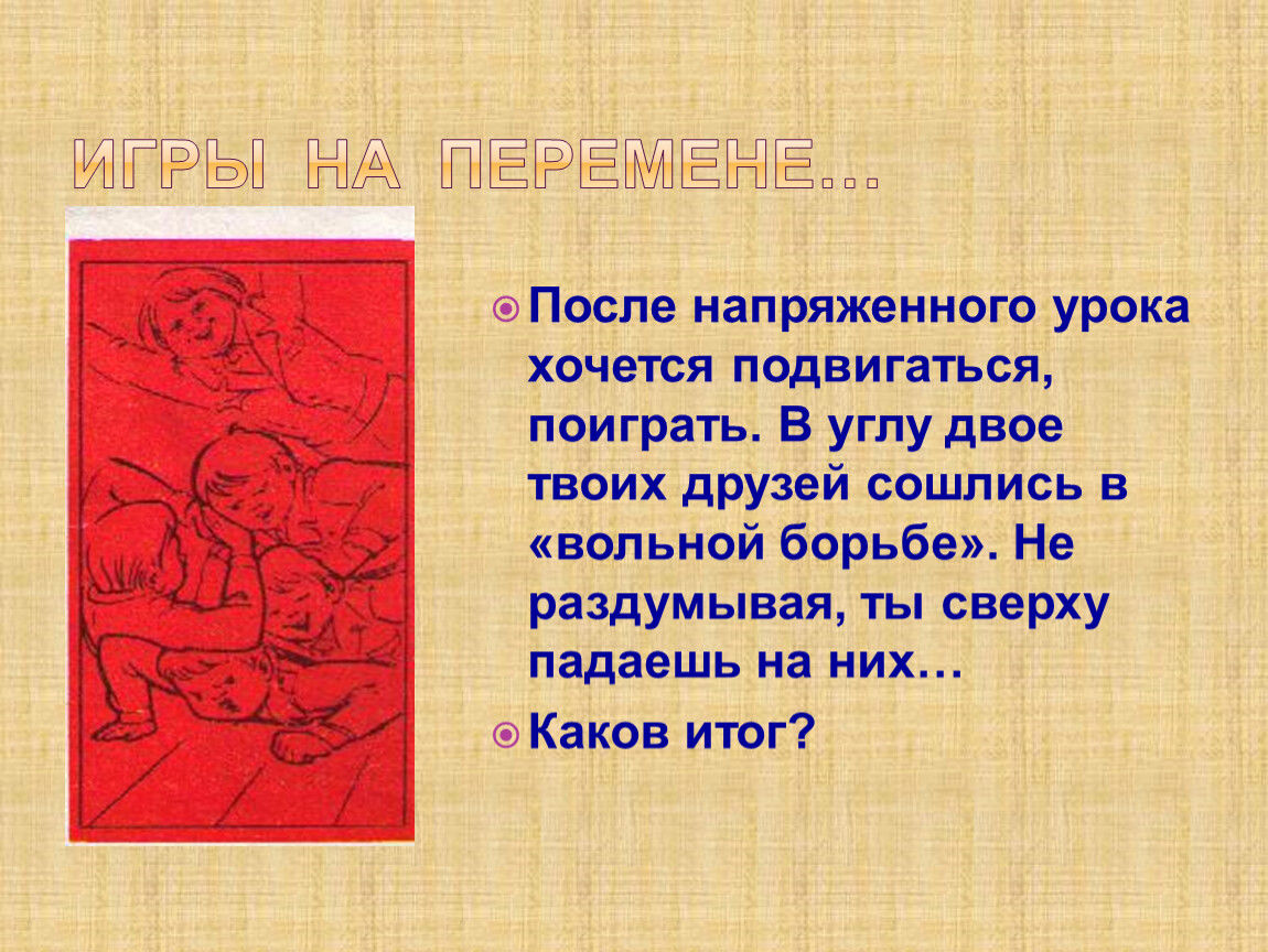 После напряженного урока хочется подвигаться, поиграть. В углу двое твоих друзей сошлись в «вольной борьбе». Не раздумывая, ты сверху падаешь на них…