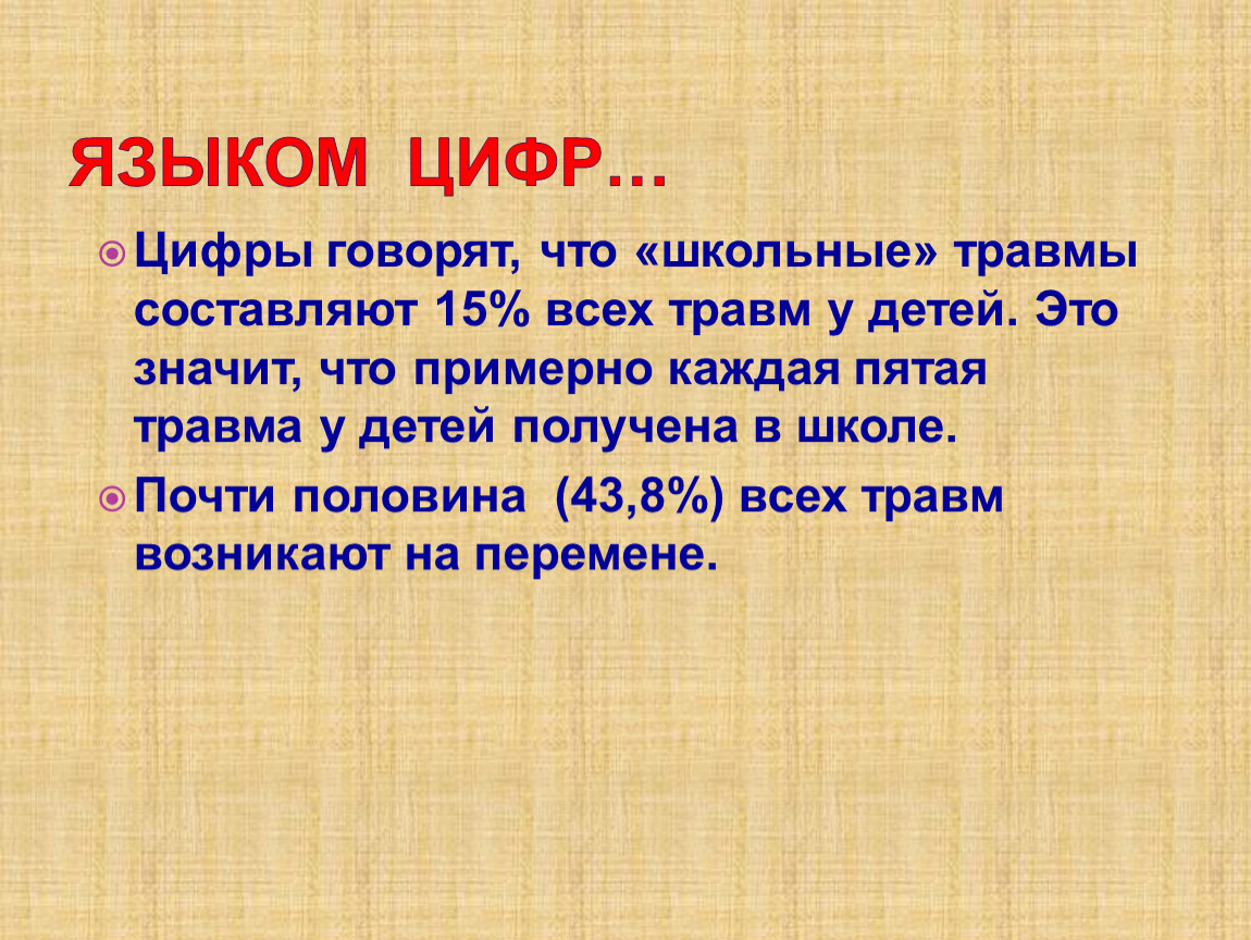 Цифры говорят, что «школьные» травмы составляют 15% всех травм у детей. Это значит, что примерно каждая пятая травма у детей получена в школе.