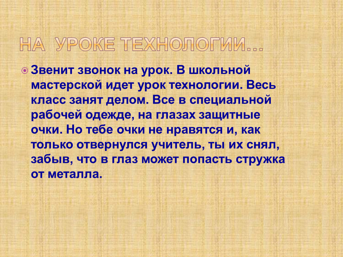 Звенит звонок на урок. В школьной мастерской идет урок технологии. Весь класс занят делом. Все в специальной рабочей одежде, на глазах защитные очки. Но тебе очки не нравятся и, как только отвернулся учитель, ты их снял, забыв, что в глаз может попасть стружка от металла.