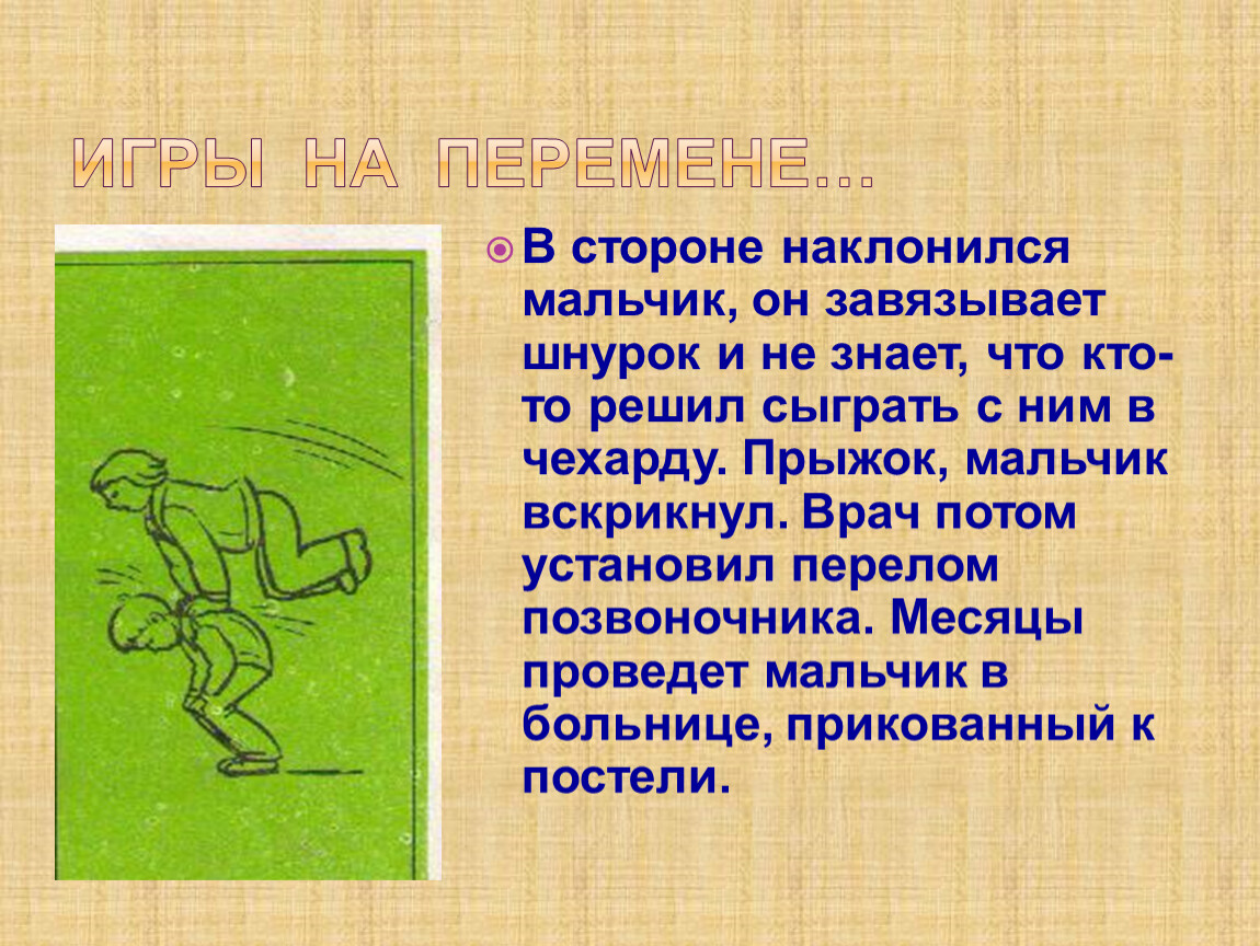 В стороне наклонился мальчик, он завязывает шнурок и не знает, что кто-то решил сыграть с ним в чехарду. Прыжок, мальчик вскрикнул. Врач потом установил перелом позвоночника. Месяцы проведет мальчик в больнице, прикованный к постели.