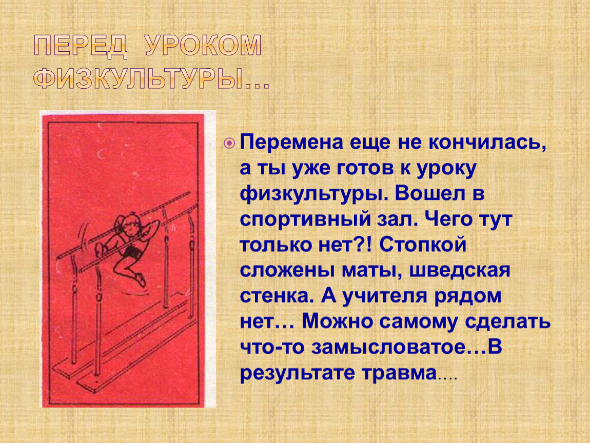 Перемена еще не кончилась, а ты уже готов к уроку физкультуры. Вошел в спортивный зал. Чего тут только нет?! Стопкой сложены маты, шведская стенка. А учителя рядом нет… Можно самому сделать что-то замысловатое…В результате травма….