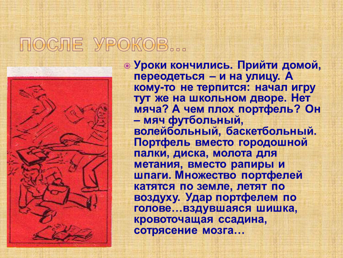 Уроки кончились. Прийти домой, переодеться – и на улицу. А кому-то не терпится: начал игру тут же на школьном дворе. Нет мяча? А чем плох портфель? Он – мяч футбольный, волейбольный, баскетбольный. Портфель вместо городошной палки, диска, молота для метания, вместо рапиры и шпаги. Множество портфелей катятся по земле, летят по воздуху. Удар портфелем по голове…вздувшаяся шишка, кровоточащая ссадина, сотрясение мозга…