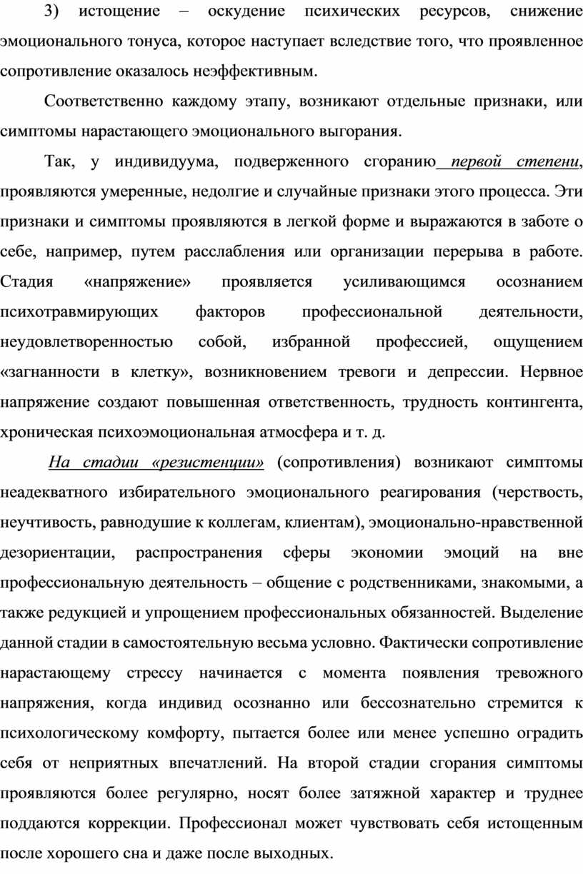 3) истощение – оскудение психических ресурсов, снижение эмоционального тонуса, которое наступает вследствие того, что проявленное сопротивление оказалось неэффективным.