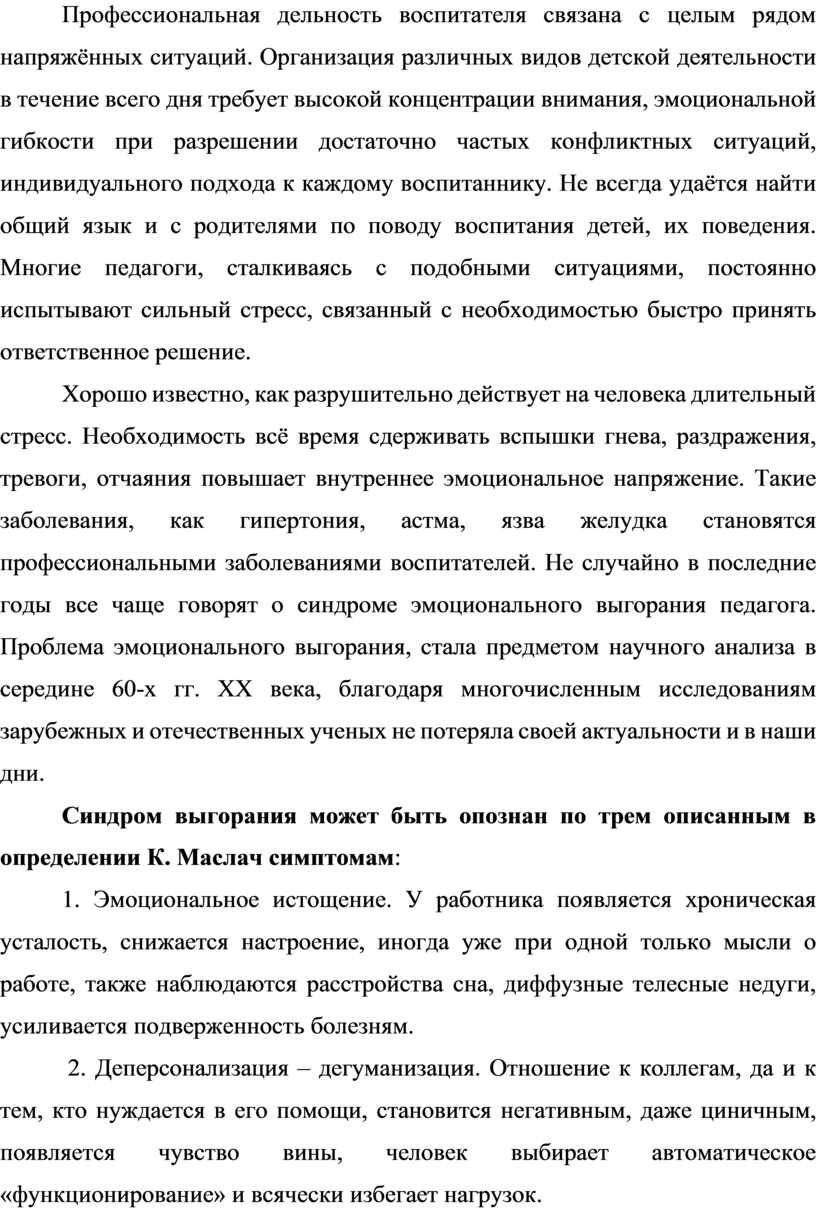 Хорошо известно, как разрушительно действует на человека длительный стресс. Необходимость всё время сдерживать вспышки гнева, раздражения, тревоги, отчаяния повышает внутреннее эмоциональное напряжение. Такие заболевания, как гипертония, астма, язва желудка становятся профессиональными заболеваниями воспитателей. Не случайно в последние годы все чаще говорят о синдроме эмоционального выгорания педагога. Проблема эмоционального выгорания, стала предметом научного анализа в середине 60-х гг. XX века, благодаря многочисленным исследованиям зарубежных и отечественных ученых не потеряла своей актуальности и в наши дни.