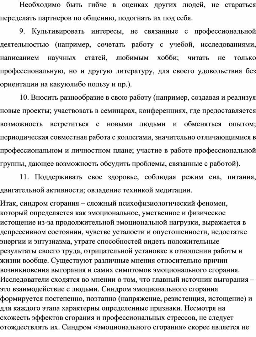 9. Культивировать интересы, не связанные с профессиональной деятельностью (например, сочетать работу с учебой, исследованиями, написанием научных статей, любимым хобби; читать не только профессиональную, но и другую литературу, для своего удовольствия без ориентации на какуюлибо пользу и пр.).