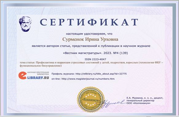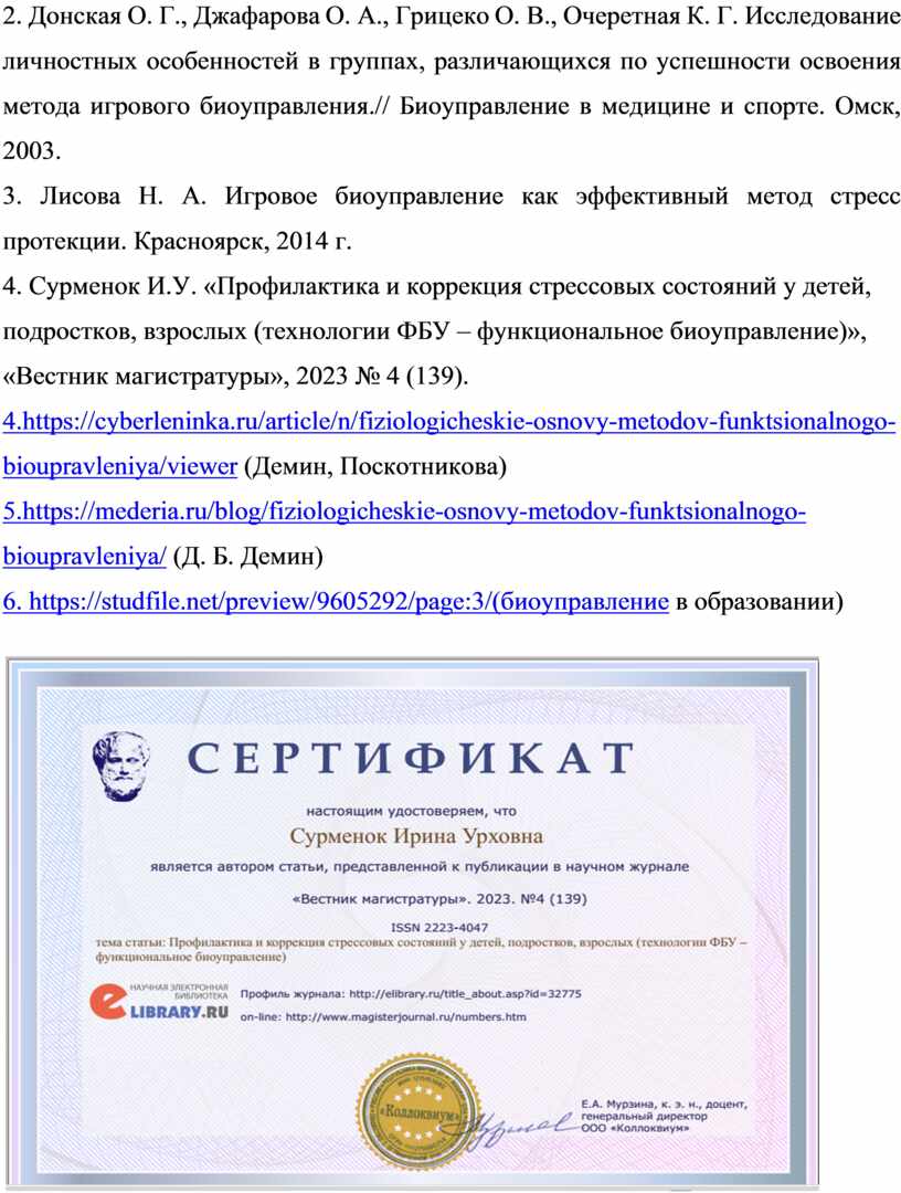 4. Сурменок И.У. «Профилактика и коррекция стрессовых состояний у детей, подростков, взрослых (технологии ФБУ – функциональное биоуправление)», «Вестник магистратуры», 2023 № 4 (139).