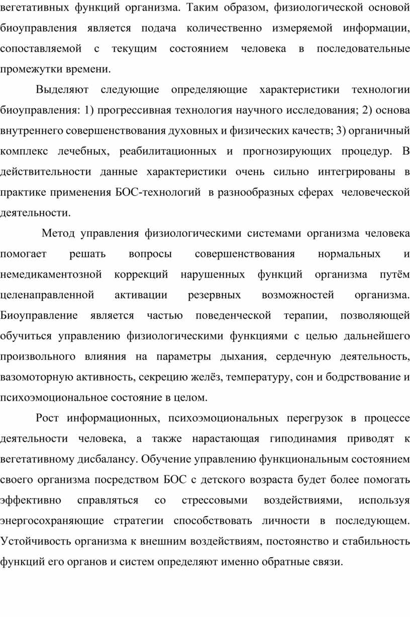 Таким образом, биоуправление можно рассматривать как ветвь поведенческой терапии, целью которой является регуляция психофизиологического состояния, в том числе здорового человека, в условиях эмоционально напряжённой деятельности. Данный метод управления непроизвольными процессами организма, контролируемыми вегетативной нервной системой, при котором снижение уровня эмоционального стресса выступает в качестве полезного приспособительного результата, определяющего деятельность функциональных систем, сформированных для его достижения.