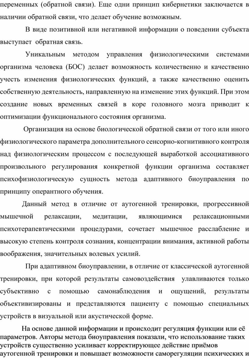 Организация на основе биологической обратной связи от того или иного физиологического параметра дополнительного сенсорно-когнитивного контроля над физиологическим процессом с последующей выработкой ассоциативного произвольного регулирования конкретной функции организма составляет психофизиологическую сущность метода адаптивного биоуправления по принципу оперантного обучения.