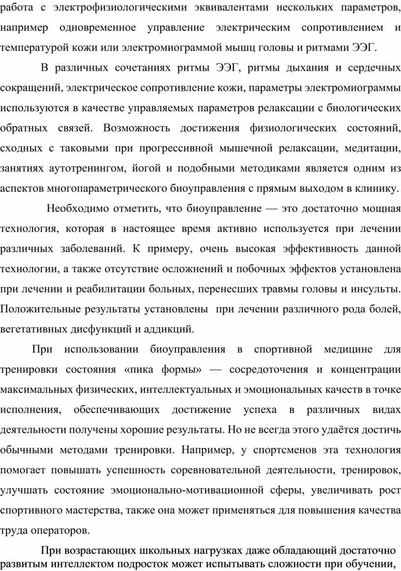 Методы функционального биоуправления, базирующиеся на принципах биологической обратной связи (БОС), в настоящее время активно используются как в медицине, так и в различных психокоррекционных и личностно – развивающих практиках. Термин «биологическая обратная связь)